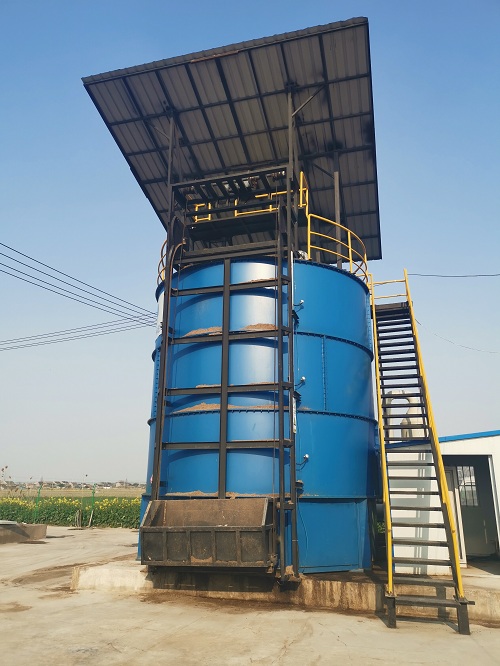 智能型機肥發酵罐是一種集畜禽糞便原料收集、存貯及發酵功能為一體的好氧堆肥發酵設備,適用于對環境要求較高的畜禽養殖場、園林廢棄物處理廠、廚余垃圾處理廠、農業污泥處理廠、豆粕、木薯渣及米糠等好氧發酵飼料加工廠等對畜禽糞便、廚余垃圾、生活污泥等進行高溫好氧發酵。結構緊湊,占地面積小,無需建設廠房,無臭味,自動化程度高,節能環保。發酵筒倉主要由支撐臺架、筒倉主體、頂部擋板、保溫層、溫控系統、高強度連接件等組成。該型號發酵筒倉體積約90m3,日糞污處理能力約為12-15m3。