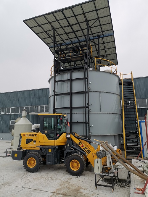 畜禽糞便有機肥發酵罐是一種集原料收集、存貯及發酵功能為一體的好氧堆肥發酵裝置,適用于對環境要求較高的養殖場、園林廢棄物處理廠、廚余垃圾處理廠、農業污泥處理廠、豆粕、木薯渣及米糠等好氧發酵飼料加工廠等對畜禽糞便、廚余垃圾、生活污泥等進行高溫好氧發酵。結構緊湊,占地面積小,無需建設廠房,無臭味,自動化程度高,節能環保。發酵筒倉主要由支撐臺架、筒倉主體、頂部擋板、保溫層、溫控系統、高強度連接件等組成。該型號發酵筒倉體積約90m3,日糞污處理能力約為12-15m3。