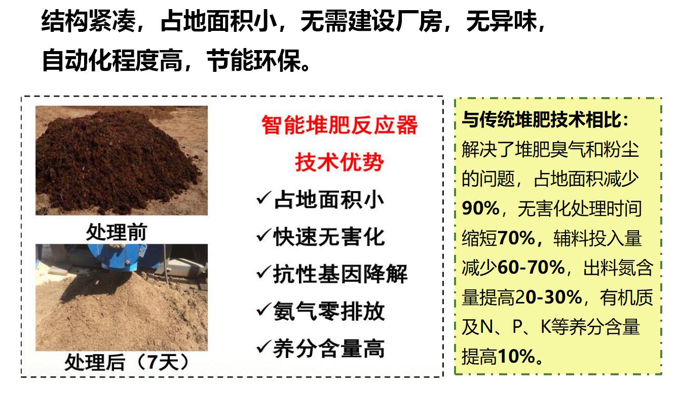畜禽糞便有機肥發酵罐將儲存和處理過程合二為一,通過調氧控溫、理化固氮和微生物降解,實現畜禽糞尿處理時間縮短70% ,氨氣揮發減少53%,養分含量提高15%-20%,抗生素及抗性基因降解率超過90%。